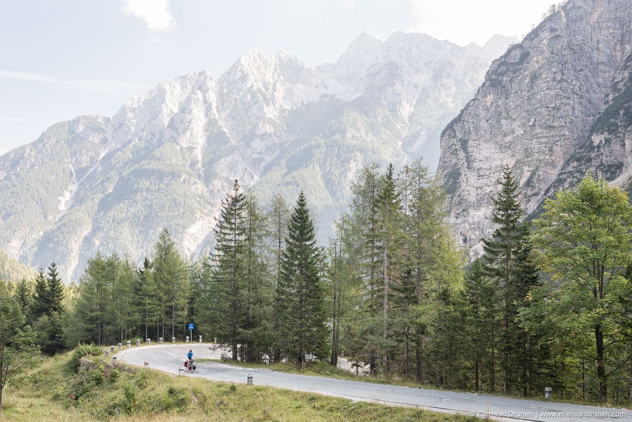 We beginnen de klim naar de Vrsic Pas op 1611 meter hoogte. Vanaf Kransjka Gora (een leuk stadje!) is het slechts 11 kilometer naar de top, met een aantal pittige stukken er tussen over klinkertjes.