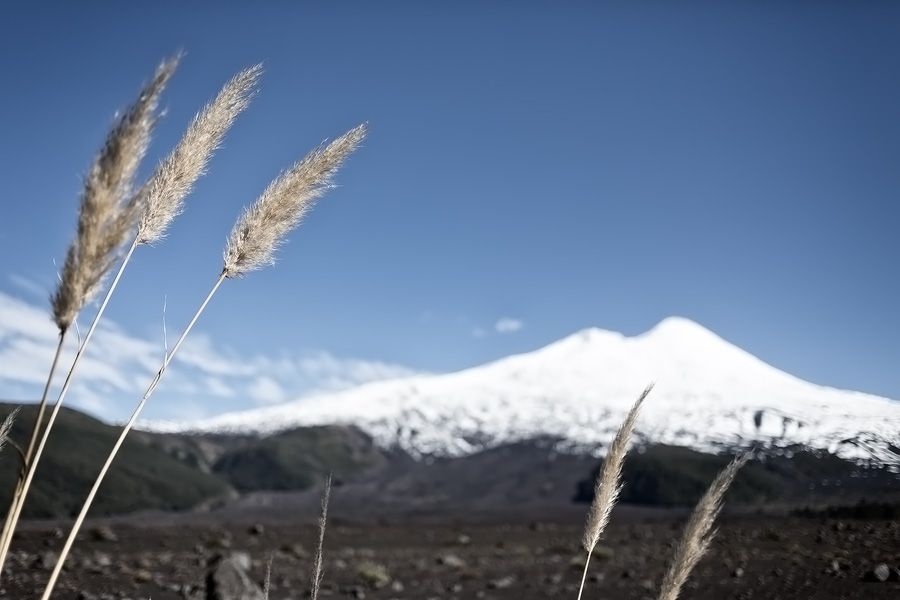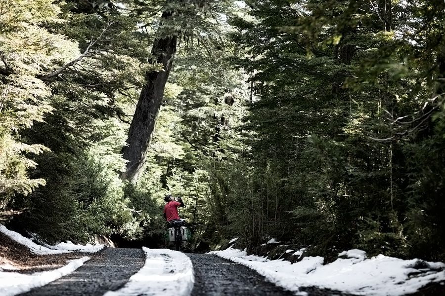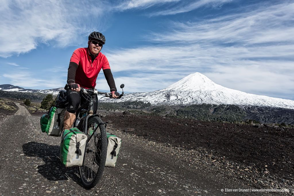 Vulcan Llaima is bijna een perfecte exemplaar met z’n wit besneeuwde top en zwarte lavasteen hellingen. De track waar we over fietsen is diep zwart lava zand en naast wat lage bosjes, groeit er niet veel hier. Het is een maanlandschap, misschien wel meer door de recente uitbarsting in 2008. Na zo’n 15 kilometer zijn we weer uit de gevarenzone en fietsen we door een frisgroen bos met hoge bomen en een enkel meertje met dode bomen erin. Leuk feitje: in dit gebied is de beroemde BBC documentaire ‘Walking with Dinosaurs’ opgenomen. Nu maar hopen dat er geen T-rex achter een boom staat 😉