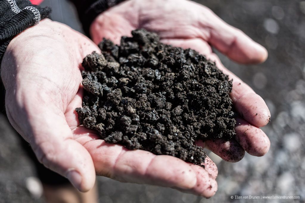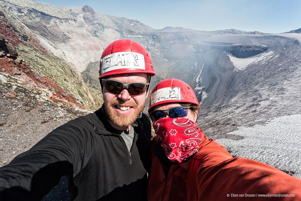 What goes up, must go down! De weg omhoog hebben we speciale kleding mee gedragen in onze rugzakken om naar beneden te glijden: een soort mini-slee die je tussen je benen klemt en een ijspriem om mee bij te sturen en te remmen. 600 meter naar beneden! Het ziet er spannend uit, maar groepsdruk is een dingetje hoor… dus ook wij springen in het diepe, als een gek over de steile helling naar beneden. En, het is echt te gek! Het eerste stuk gebruik we de priem nog geregeld, maar de adrenaline neemt het al snel over en we roetsjen naar beneden over de sneeuw; een glimlach van oor tot oor. Nog een keer! Als een kind zo blij en teleurgesteld als we het zwarte lavazand bereiken en we verder moeten lopen. Dat was echt te gek!