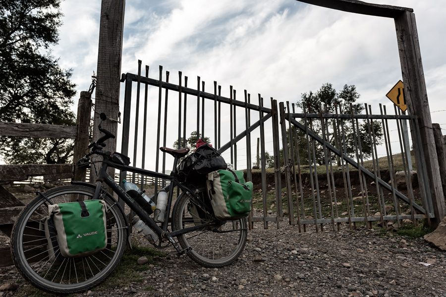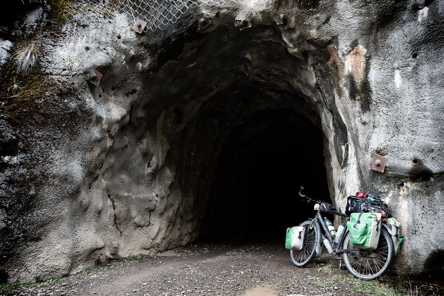 Net voorbij Troyo komen we op een splitsing uit; de linkertrack ziet er best goed uit, dus we nemen de rechter track! 😉 Een paar honderd meter verder eindigt de weg bij een heel smal en donker tunneltje. Net breed genoeg voor een kleine auto of een verdwaalde wereldfietser. Maar na de tunnel ligt een volgend obstakel, want de weg eindigt gewoon bij een hek! We kijken even rond, maar we zien niks: geen huis, geen mensen, geen auto’s, helemaal niks. Er is een kleine opening voor wandelaars en we besluiten er gewoon voor te gaan en duwen onze fietsen door het hek naar vermoedelijk prive-land.