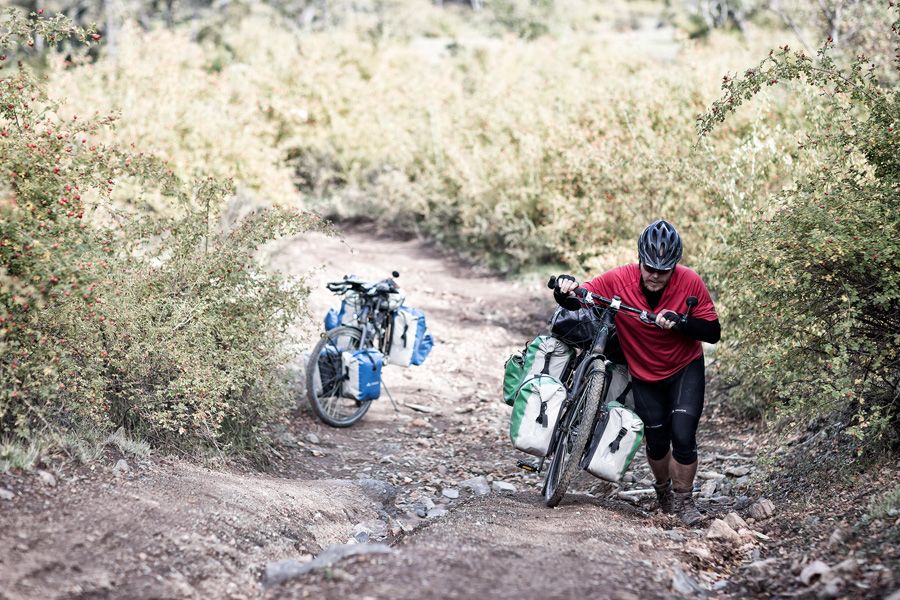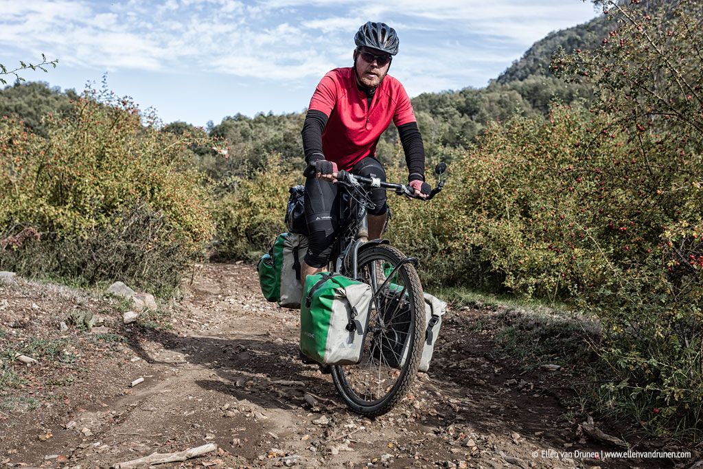 Wow, dit wordt een zware dobber! De track is smal, vol met rotsen en diepe geulen en heel, heel erg steil! Ik bedoel, 20 tot soms wel 25%! Fietsen lukt niet meer, dus het wordt weer eens duwen. Sommige stukken moeten we 1 fiets tegelijk omhoog duwen, zo steil is het. Het duurt uren voordat we een no-name pas bereiken, maar naar beneden is het ook niet makkelijk over de losse keien. Na 8 uur zware arbeid geeft de kilometerteller slechts 15 kilometer aan!