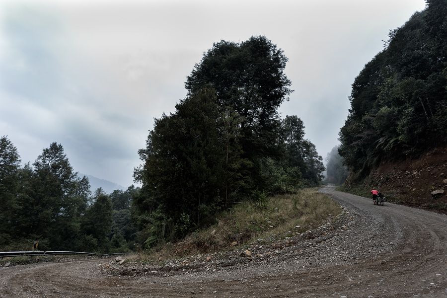 Kijkend naar onze kaart, zien we een dun grijs lijntje lopen van Lonquimay naar Ralco. Dat ziet er uitdagend uit! We slaan voor een paar dagen eten in en in dikke mist verlaten we Lonquimay en hobbelen de eerste 10 kilometer over een zanderig pad; het is nu al hard werken, maar little did we know…