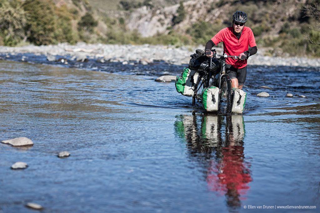 De dag begint goed: we kunnen zo’n 1,5 kilometer fietsen over een pad dat abrupt eindigt bij een rivier. Hij is behoorlijk breed, maar niet diep, dus we kunnen er vast doorheen waden. Snel de schoenen uit en de crocs aan om de fietsen door het ijswater te duwen. Brr, het is echt ontzettend koud en eenmaal aan de overkant, zijn m’n voeten gevoelloos geworden. Die kunnen we opwarmen als we weer een hele steile helling op moeten zeulen om weer uit te komen op een normale track over de ripio. We springen weer op de fietsen en rijden door naar de thermale baden van Avellano, waar we mogen kamperen én onze vermoeide lichamen in het warme water laten zakken, wat een beloning!