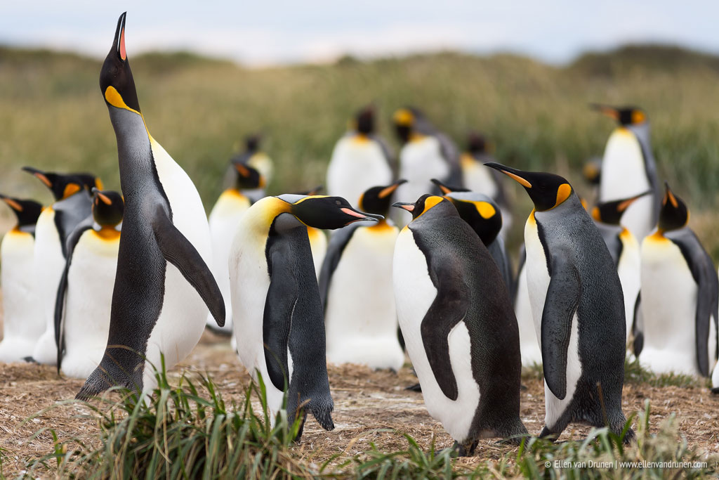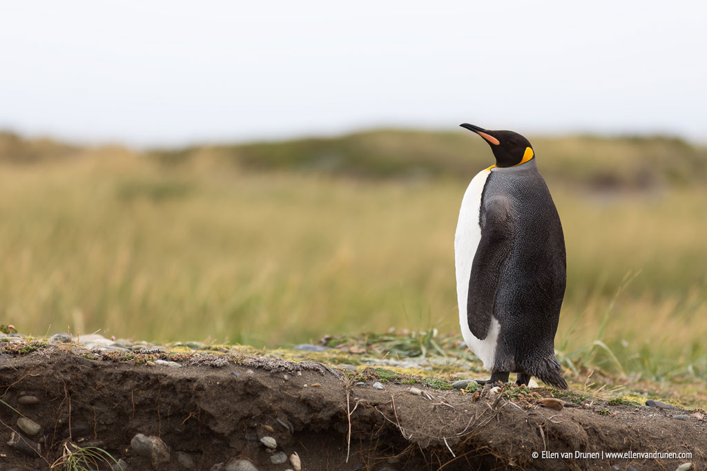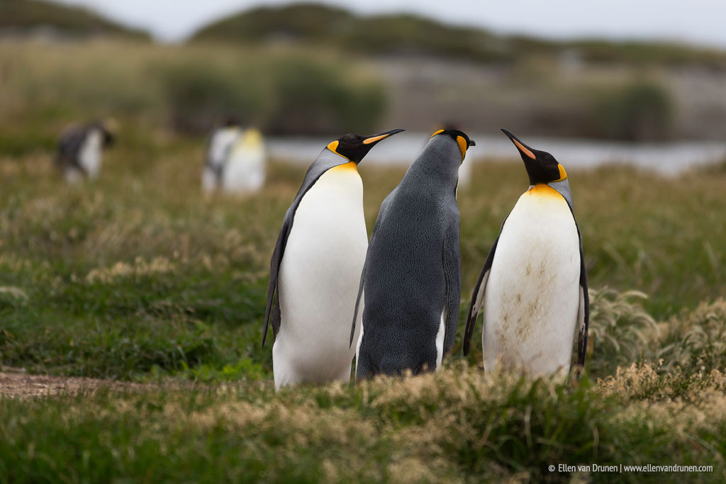 We buffelen tegen de wind en het zijn rolling hills over gravel. Het is zwoegen, maar ons doel is La Pinguinera en eindelijk zo rond 8 uur in de avond bereiken we de Pinguïn ranch, zo’n 15km ten zuiden van Onasin… een bord bij de gate zegt dat ze om 6 uur sluiten… we zijn vermoeid en gelukkig voor ons is er een beheerder aanwezig die ons binnen laat. Het is prijzig om hier te komen, maar we mogen super dicht bij de Koningspinguïns kamperen! En voordat we onze tent opzetten, wandelen we nog even naar een smal stroompje tussen ons en de mooie beesten. Ze maken behoorlijk wat lawaai, maar voor ons is dit toch echt wel genieten hoor.