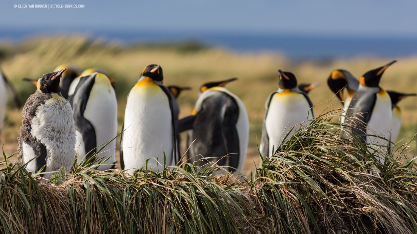 We buffelen tegen de wind en het zijn rolling hills over gravel. Het is zwoegen, maar ons doel is La Pinguinera en eindelijk zo rond 8 uur in de avond bereiken we de Pinguïn ranch, zo’n 15km ten zuiden van Onasin… een bord bij de gate zegt dat ze om 6 uur sluiten… we zijn vermoeid en gelukkig voor ons is er een beheerder aanwezig die ons binnen laat. Het is prijzig om hier te komen, maar we mogen super dicht bij de Koningspinguïns kamperen! En voordat we onze tent opzetten, wandelen we nog even naar een smal stroompje tussen ons en de mooie beesten. Ze maken behoorlijk wat lawaai, maar voor ons is dit toch echt wel genieten hoor.