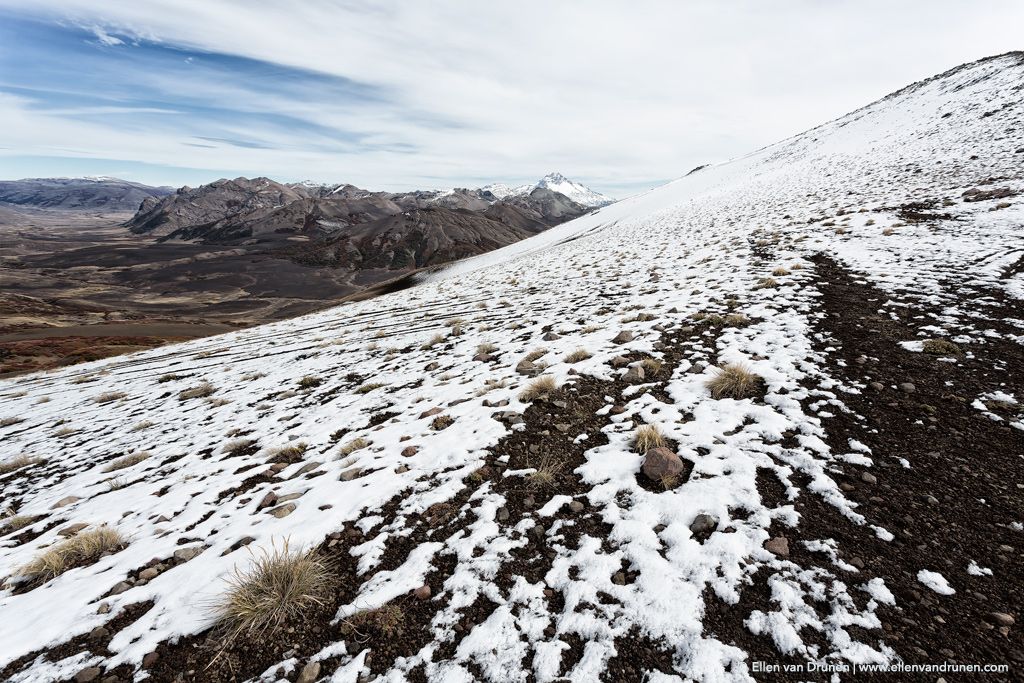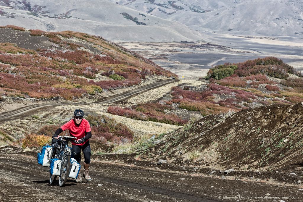 De weg is zanderig en we gaan langzaam vooruit. Het begint al frit te worden en de vegetatie is aan het verkleuren. Het zal niet lang meer duren voordat de winter hier begint. Eenmaal boven op Paso Pichachen ligt er sneeuw en ijs op de weg. Een lange afdaling ligt voor ons – nahja afdaling – er zitten nog genoeg pukkels in!