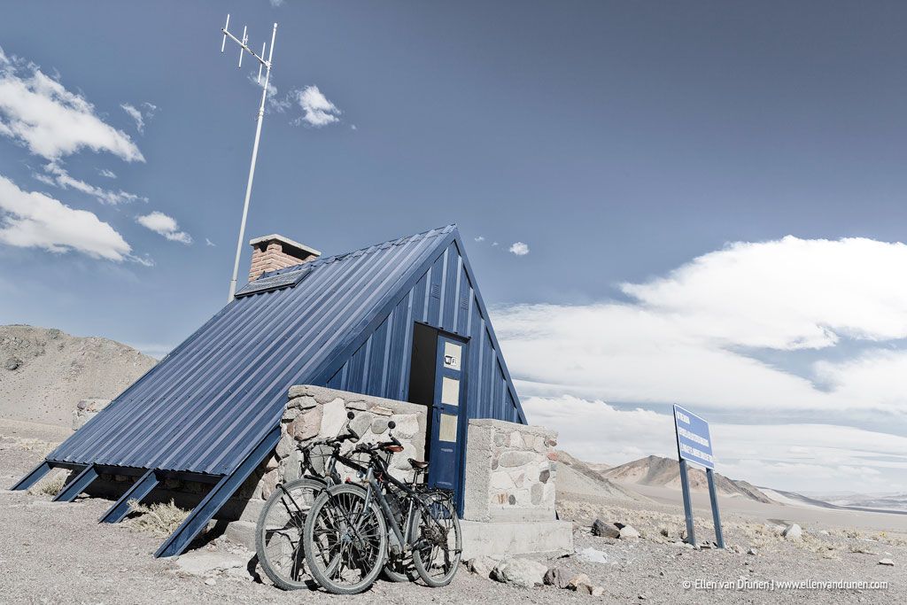 We zwoegen verder, en uiteindelijk moeten we toch echt met de fiets aan de hand en kop naar beneden de fietsen duwen.. bocht voor bocht, meter voor meter. Eindelijk bereiken we de top van de pas, ik kan nauwelijks normaal ademen, het is ijzig en guur en ver onder nul graden… tot ons geluk staat er een refugio op de top, zodat we uit de wind iets kunnen eten. Binnen kookt Elmar soep voor ons, zodat we wat op kunnen warmen voor de afdaling. Lang kunnen we hier niet blijven, want we willen lager slapen dan de pas en de keiharde tegenwind en het slecht wegdek maken het niet makkelijker. M’n vingers zijn gevoelloos van de kou en we stoempen verder, om zoveel mogelijk meters te maken voor de nacht valt.