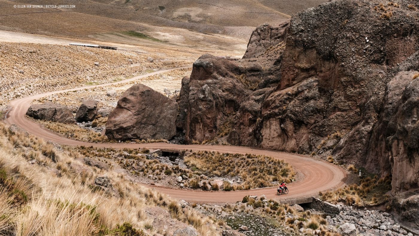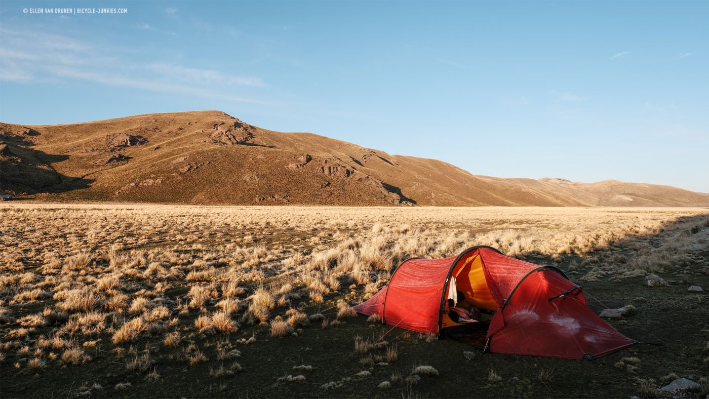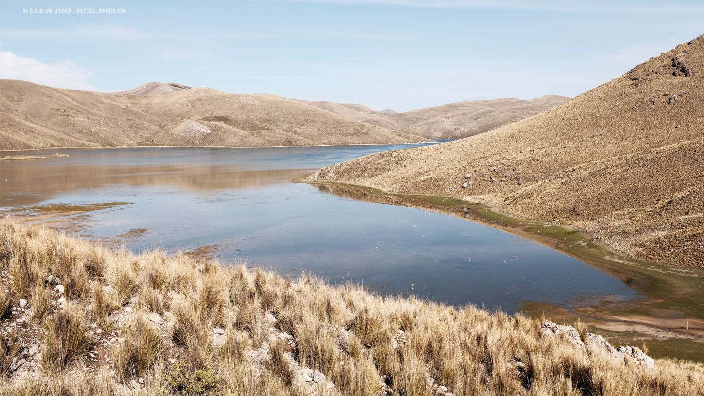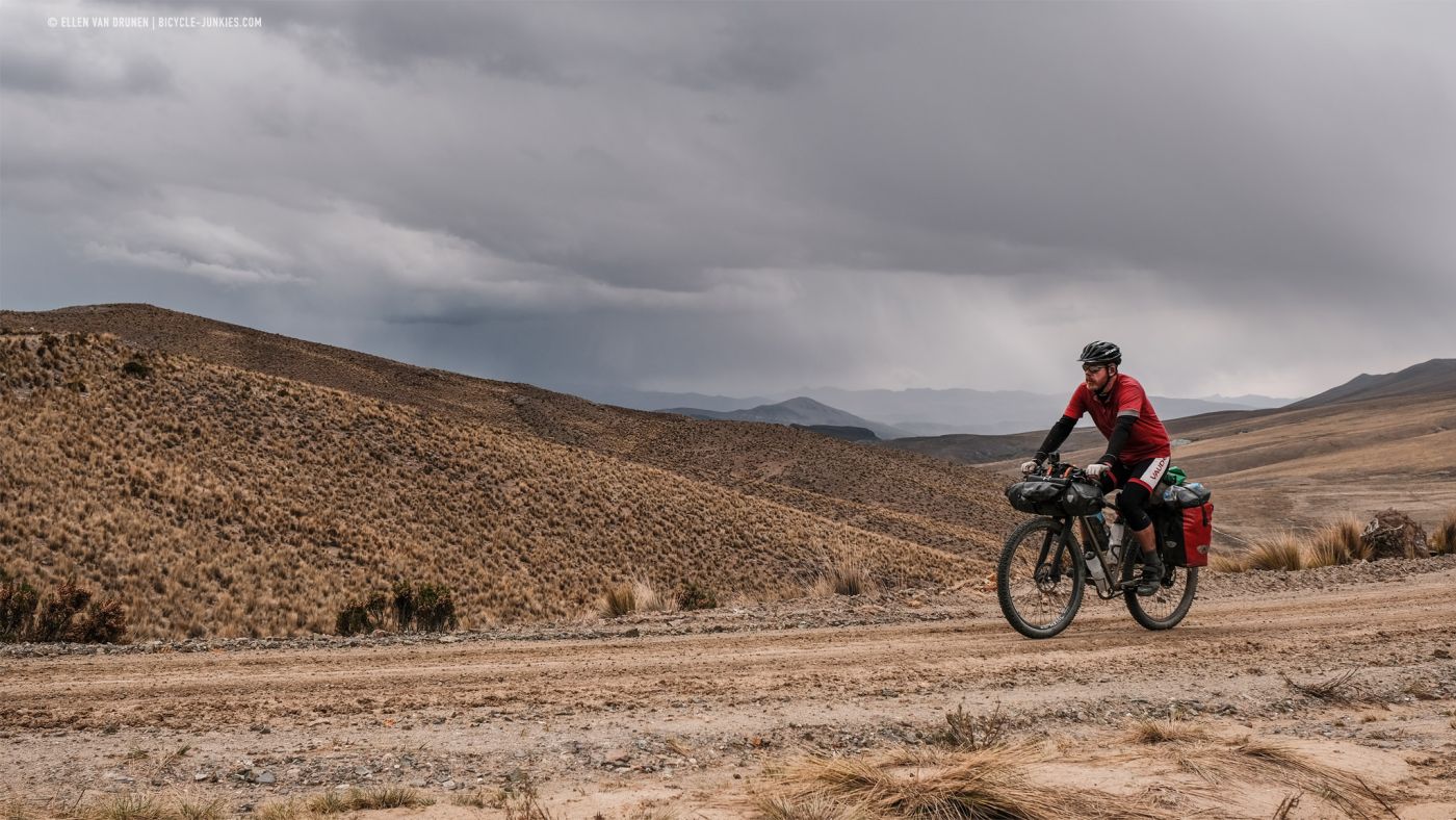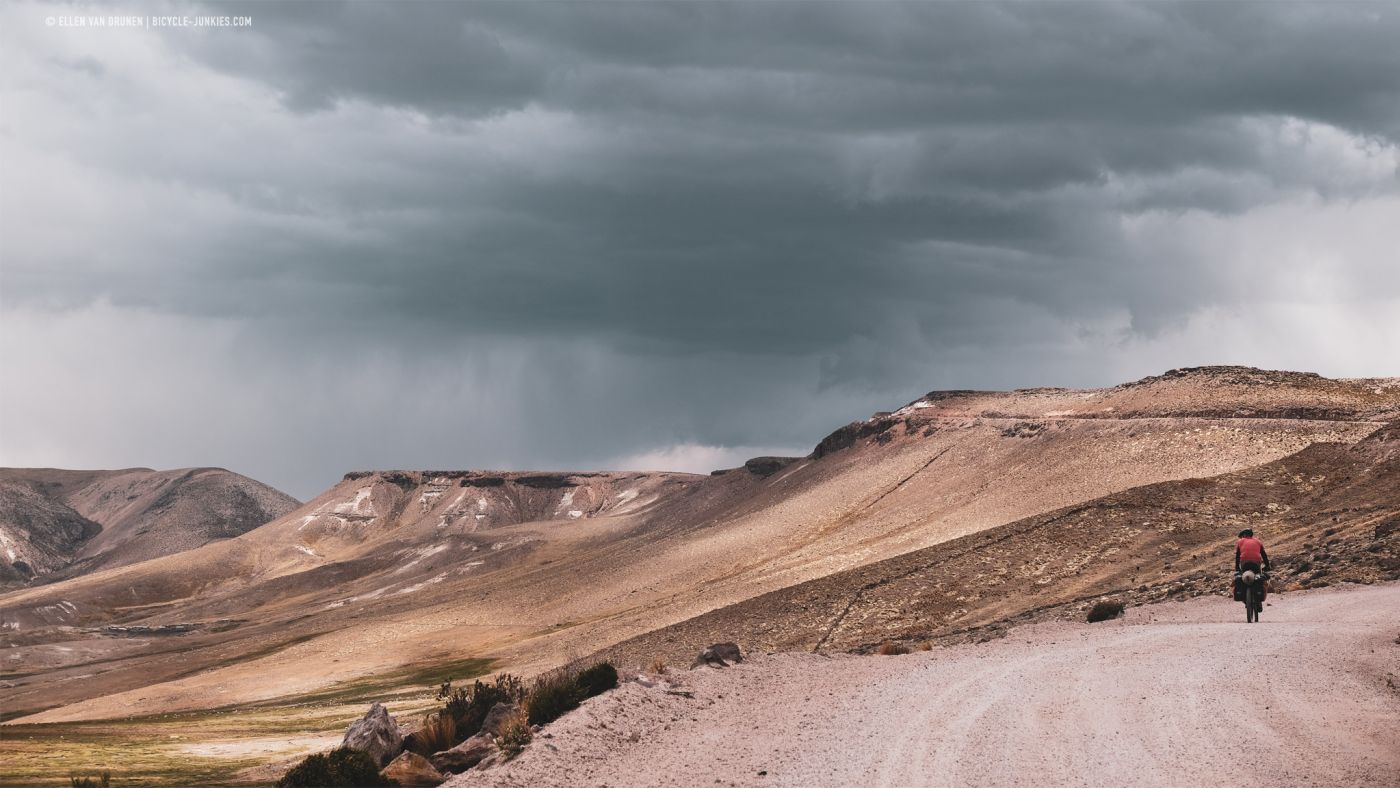 Langs een diep, groen dal klimmen we langzaam verder omhoog. Beneden ons loopt een herder met een grote kudde Alpacas en voor ons rollen donkere wolken het dal in. De wind neemt toe en het dondert en bliksemt steeds dichterbij. Op deze smalle richel is geen mogelijkheid om onze tent op te zetten en we kunnen alleen maar proberen de pas over te fietsen en hopen dat het aan de andere kant beter is. Nog voordat we de top bereiken, slaat de hagel hard in onze gezichten en vechten we niet alleen tegen de hoogte en de zwaartekracht, maar is ook de wind niet onze beste vriend. Zo snel als we kunnen ronden we de laatste bocht en zien we naast een kleine heuvel een plek om onze tent veilig op te zetten. Het is een lange middag in de tent, terwijl regen, wind en onweer aan ons voorbij trekken. Het is maar goed dat we dit plekje hebben gevonden, want de volgende ochtend blijkt dat er werkelijk geen enkele beschutting te vinden was geweest op de enorme hoogvlakte.