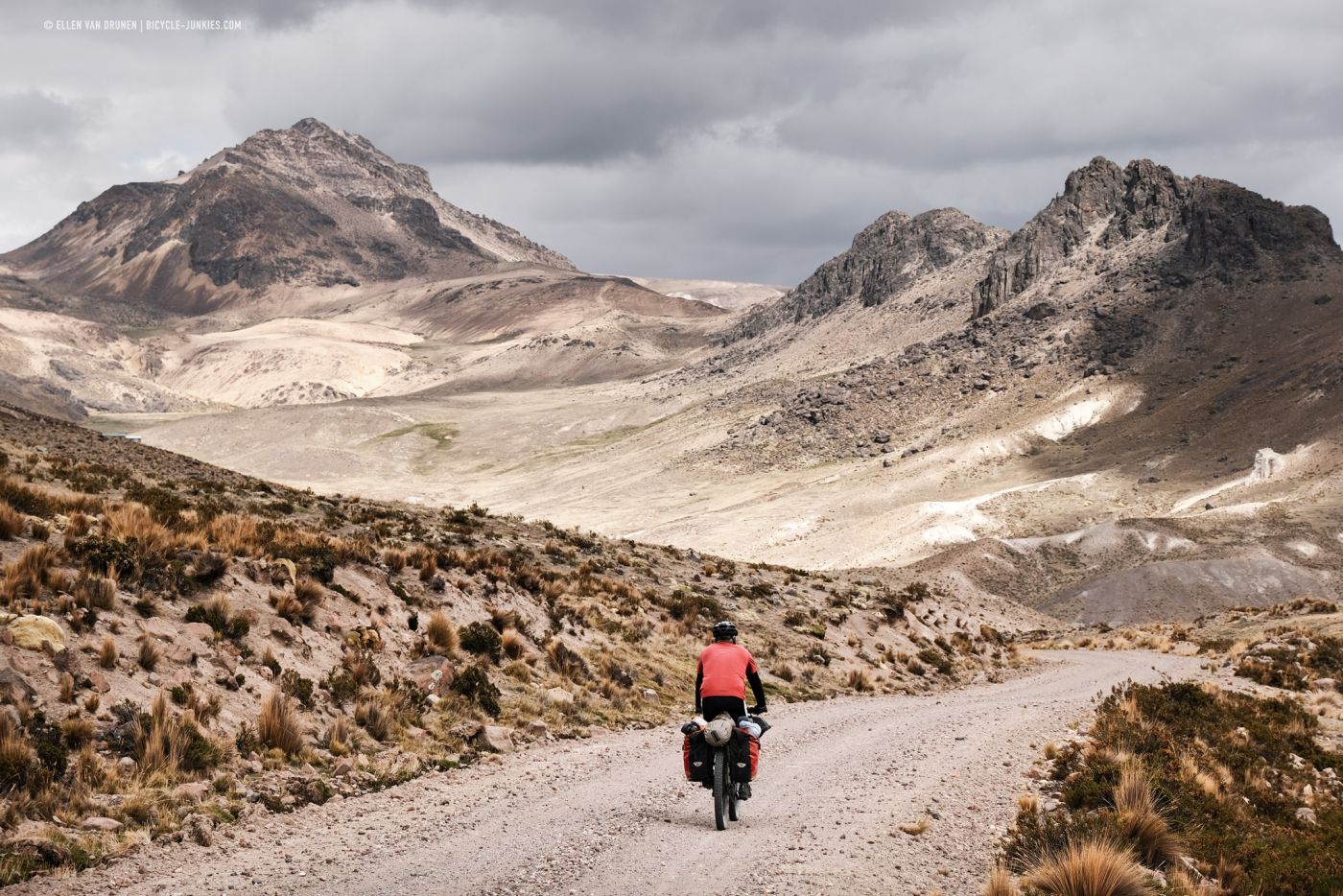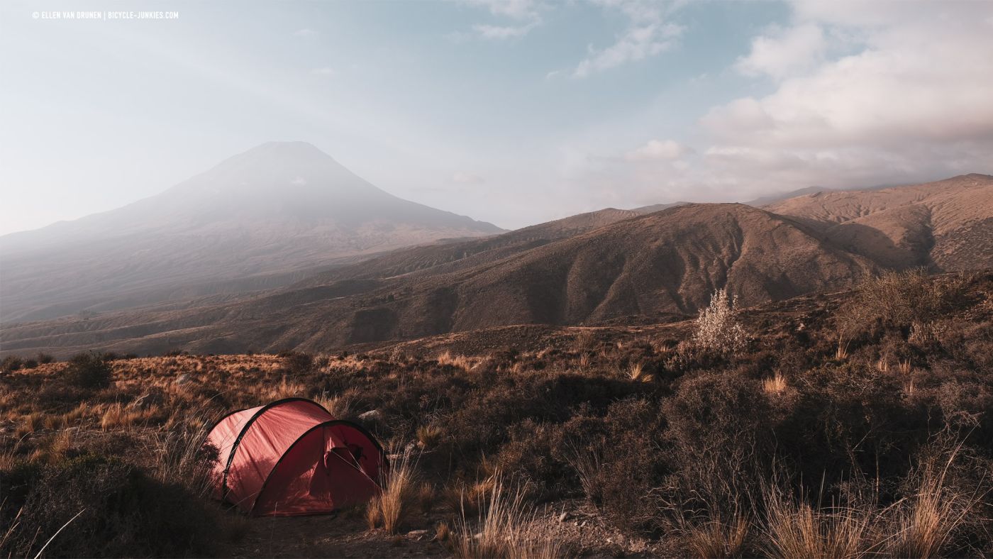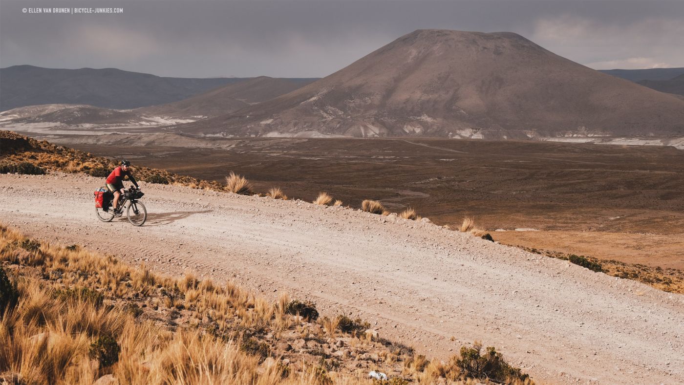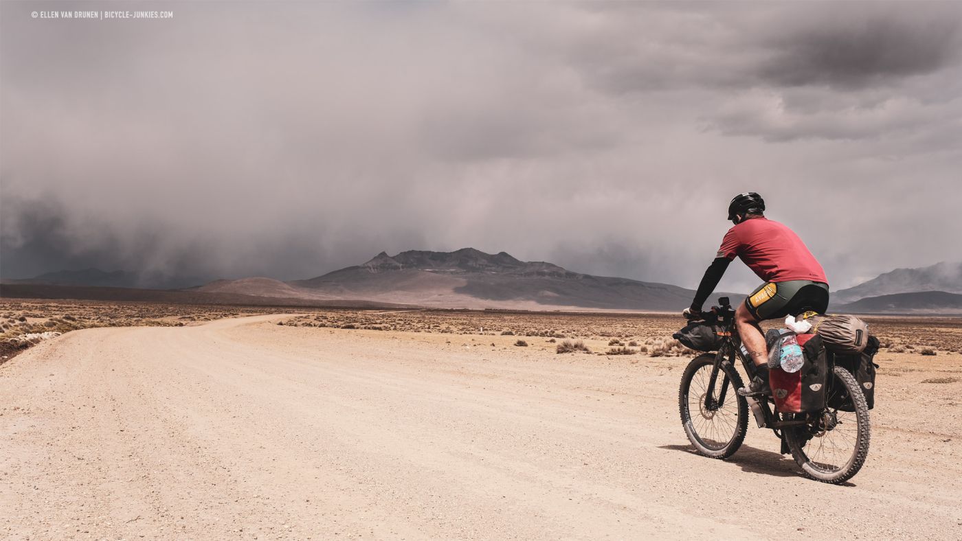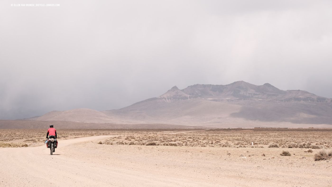 Langs een diep, groen dal klimmen we langzaam verder omhoog. Beneden ons loopt een herder met een grote kudde Alpacas en voor ons rollen donkere wolken het dal in. De wind neemt toe en het dondert en bliksemt steeds dichterbij. Op deze smalle richel is geen mogelijkheid om onze tent op te zetten en we kunnen alleen maar proberen de pas over te fietsen en hopen dat het aan de andere kant beter is. Nog voordat we de top bereiken, slaat de hagel hard in onze gezichten en vechten we niet alleen tegen de hoogte en de zwaartekracht, maar is ook de wind niet onze beste vriend. Zo snel als we kunnen ronden we de laatste bocht en zien we naast een kleine heuvel een plek om onze tent veilig op te zetten. Het is een lange middag in de tent, terwijl regen, wind en onweer aan ons voorbij trekken. Het is maar goed dat we dit plekje hebben gevonden, want de volgende ochtend blijkt dat er werkelijk geen enkele beschutting te vinden was geweest op de enorme hoogvlakte.