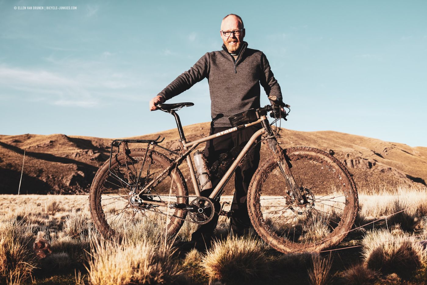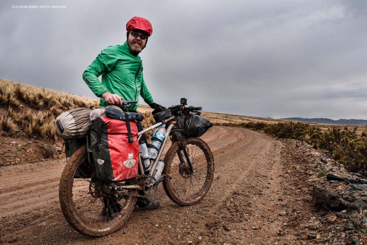 Ik schrik me werkelijk kapot! Als uit het niets, een keiharde knal vlak achter ons! Die hadden we niet zien aankomen. Meteen valt de regen met bakken uit de hemel. Snel trekken we onze regenspullen aan en proberen we hier als de sodemieter weg te komen. Niet makkelijk op deze hoogte, zeker niet wanneer de weg verandert in een plakkerige modderbende en we alle kanten op glibberen. De modder plakt aan alles, fietsen is onmogelijk en we duwen onze fietsen verder omhoog. Ik groei met elke stap een paar centimeter als de klonters onder m’n schoenen blijven plakken. Het is keihard werken: 10 meter lopen, met een stok de ergste modder overal tussen vandaan pulken en weer 10 meter verder ploeteren. Gelukkig voor ons zijn donder en bliksem verdwenen, maar de regen is er nog altijd. Kilometers lopen we met onze fietsen in de hoop dat het aan de andere kant van de pas niet geregend heeft. We zijn op, maar hier is nergens plek om onze tent op te zetten, dus gaan we maar door.