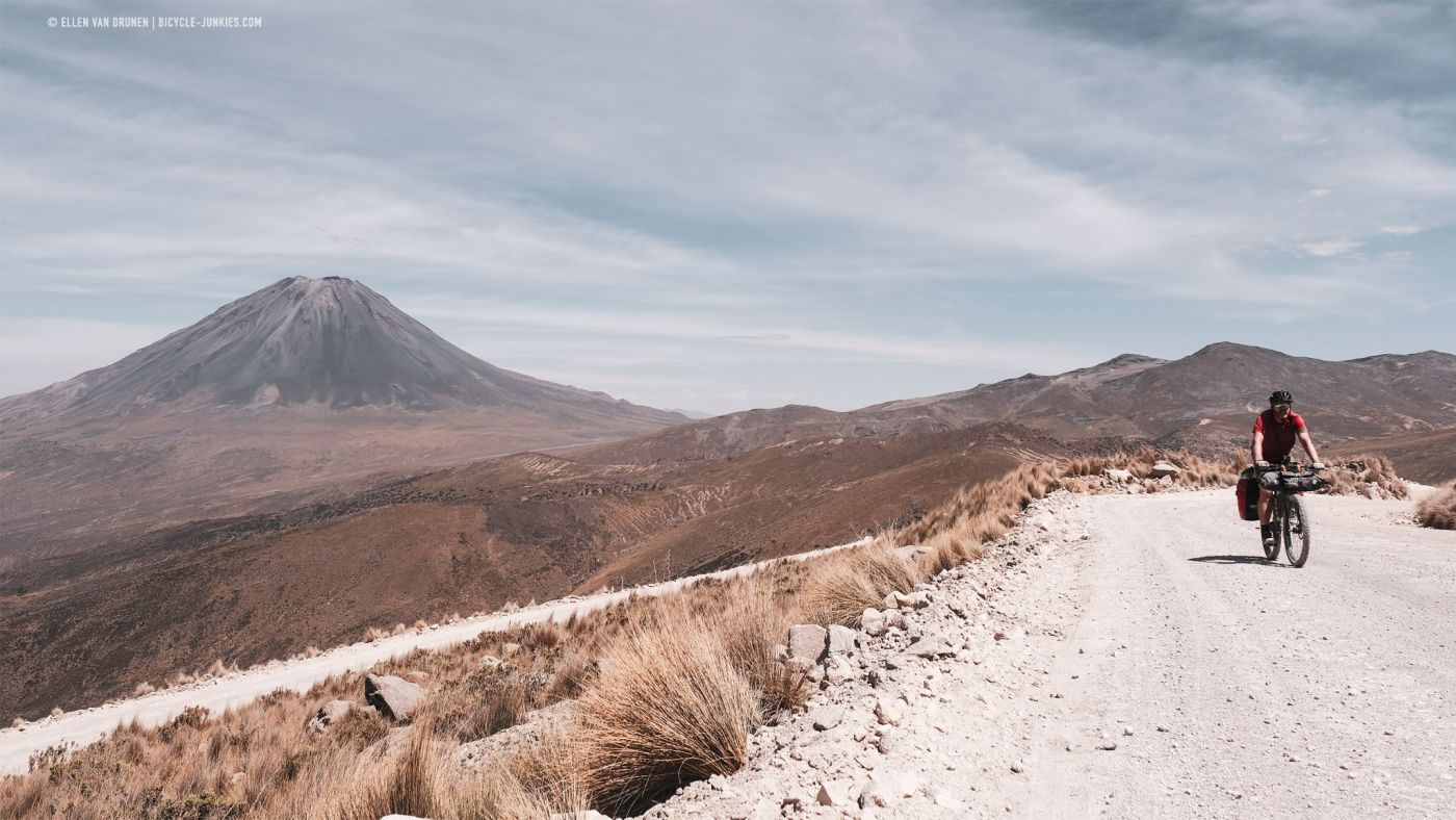 Waren we enkele dagen geleden in slechts twee uur tijd naar beneden gehobbeld, nu kijken we tegen twee dagen klimmen aan om de pas op ruim 4400m hoogte over te fietsen. We manoeuvreren onszelf door het drukke verkeer van Arequipa heen; eenmaal uit het centrum is het snel gedaan met de drukte en bevinden we ons weer in niemandsland. Ondanks ons harde werk, lukt het niet om de klim in één dag te doen en zetten we onze tent op langs de weg, met uitzicht op de vele lichtjes van de stad diep beneden ons. Vulkaan Misti waakt over ons.