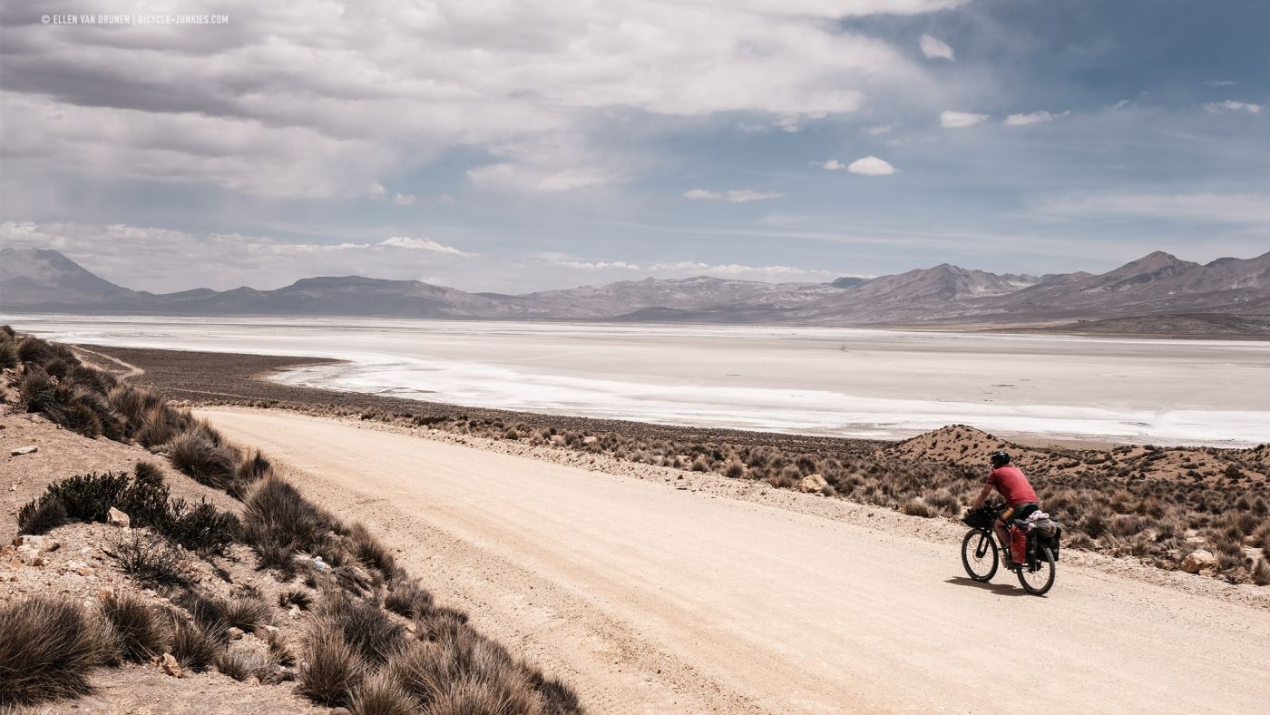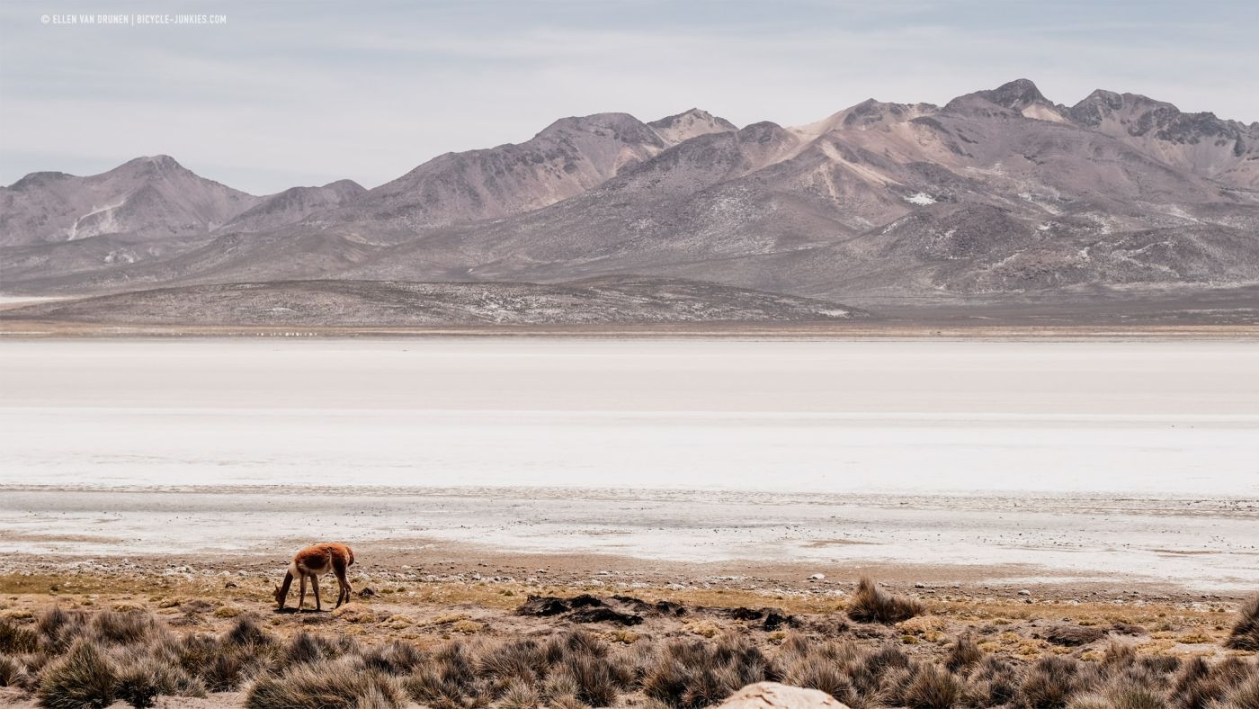 De volgende ochtend kunnen we meteen weer flink in de pedalen als we via de vele haarspeldbochten steeds verder omhoog klimmen. Het landschap wordt weer ruiger en water schaarser. Vlak voor de pas, fietsen we door een stoffige tunnel, gevolgd door een korte afdaling. We zitten nu op de hoogvlakte als we langs de leegte van Laguna Salinas fietsen.