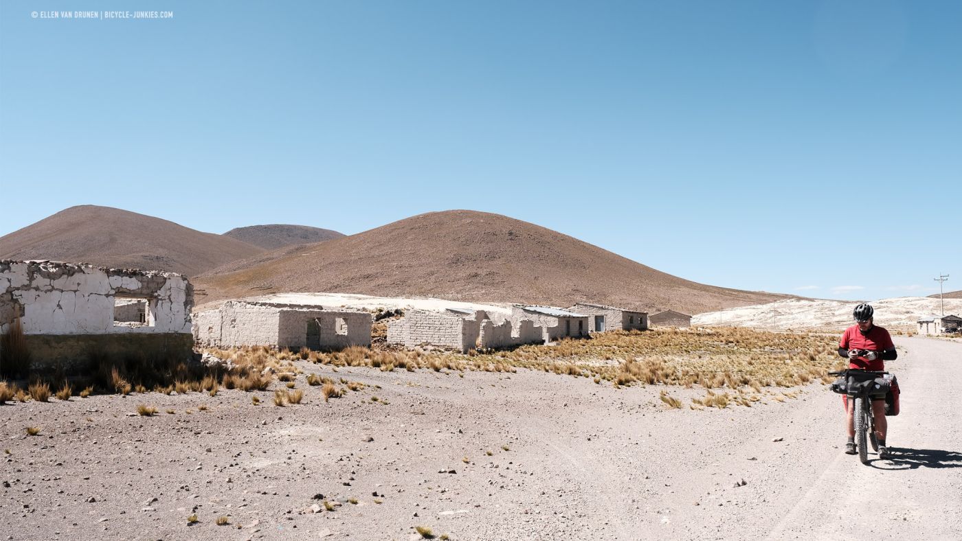 Het is 7 uur ’s ochtends als we de weg weer opdraaien en nu al warm. Stuiterend dalen we verder af tot bij een rivier. Rolling hills volgen en we passeren verlaten dorpjes in de middle of nowhere. Het is moeilijk voor te stellen dat iemand in dit landschap kan leven; nauwelijks water, alles dor en droog en zeker geen supermarkt eventjes om de hoek! Maar misschien zijn het gewoon huizen, waar mensen tijdelijk verblijven als ze met hun kudde Alpacas hier ronddwalen. Je bent hier in ieder geval compleet weg van de wereld en je hoeft je dan ook geen zorgen te maken om alle wereldse problemen! Misschien is het leven hier zo slecht nog niet?